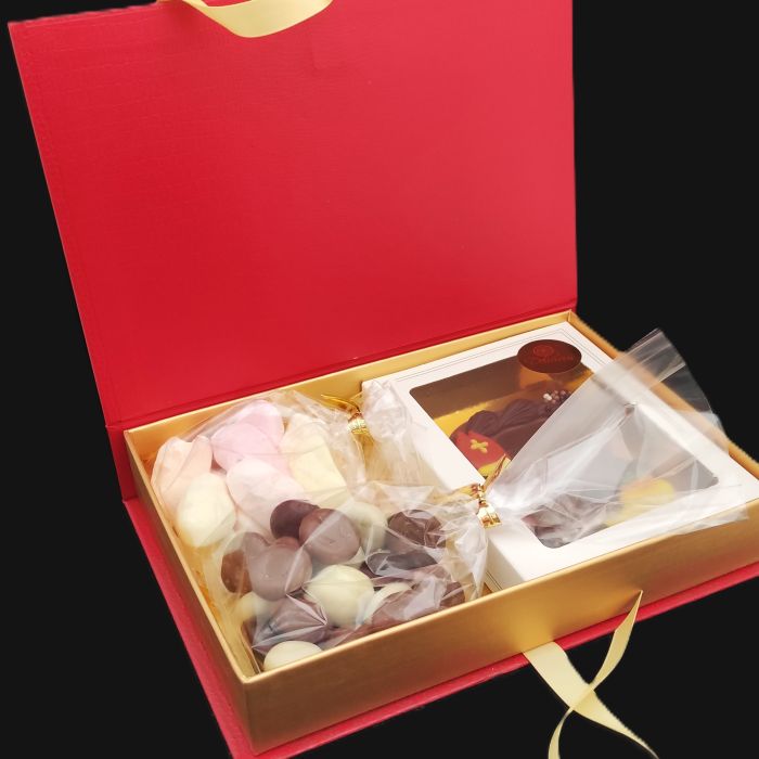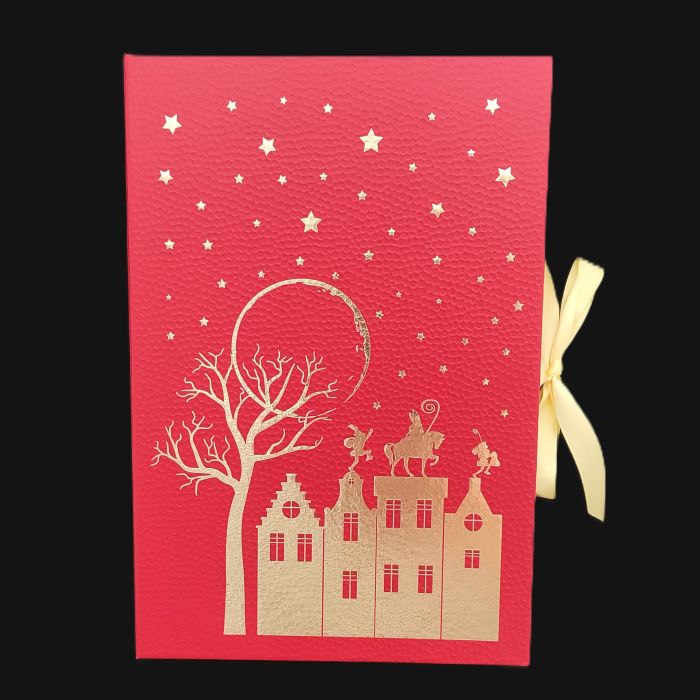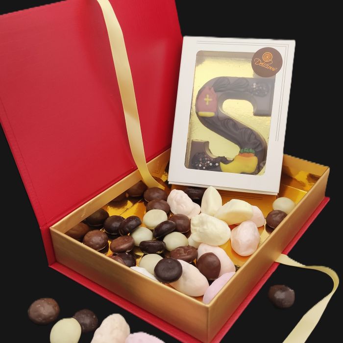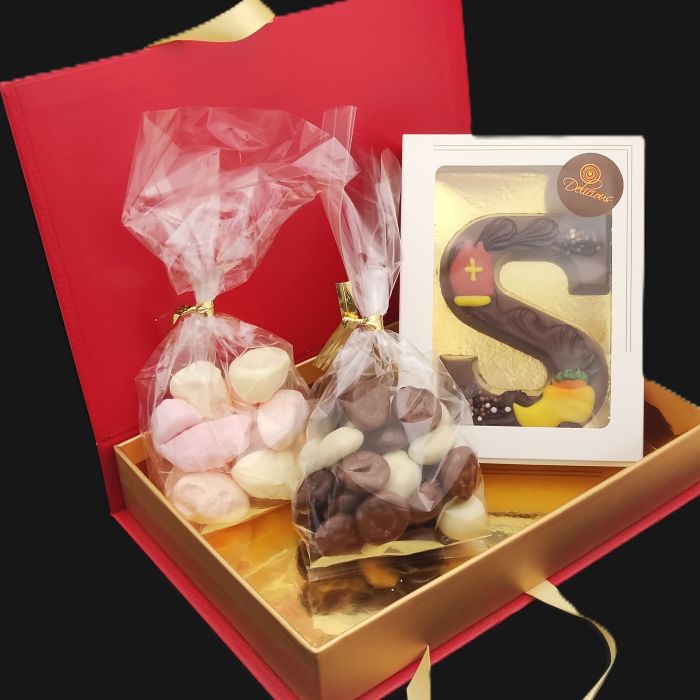 Hoe een leuk cadeau is dit! Het boek van Sinterklaas hebben we gevuld met een ambachtelijke, gedecoreerde melkchocoladeletter, extra zachte sinterklaasschuimpjes en gemengde gechocolateerde kruidnoten. In één keer je heerlijk avondje compleet!