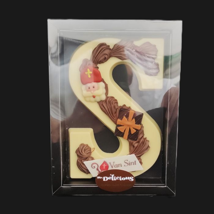 Uit eigen atelier: een handgemaakte chocoladeletter van 240 gram uitgevoerd in witte chocolade met ambachtelijke decoratie. Verpakt in luxe doos met transparant deksel. Let op: werkelijke decoratie kan iets afwijken van de foto.