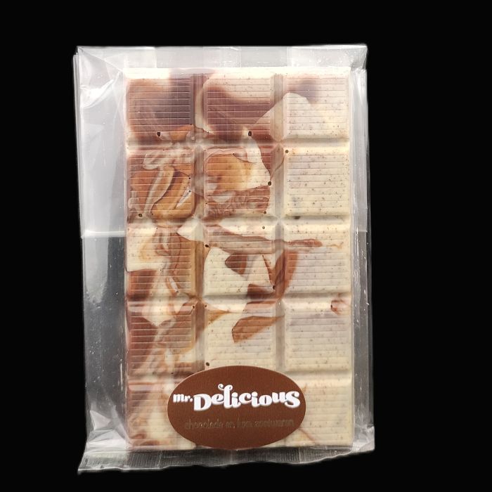 Een handgemaakte chocoladereep van witte en pure chocolade met de heerlijke smaak van melk en koffie. Per stuk van 100 gram.