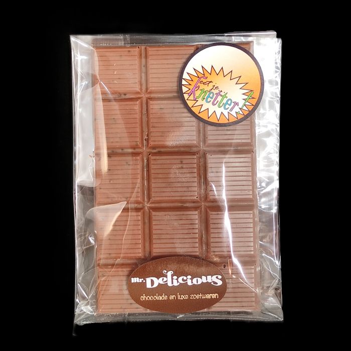 Een handgemaakte reep heerlijke melkchocolade met knisperende knettersuiker. Wanneer de chocolade in je mond smelt begint het tintelende knetter-effect. Een bijzondere sensatie die je móet proberen!!