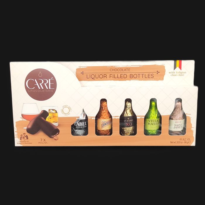 Een leuke giftbox met 7 kleine flesjes drank. De flesjes zijn gemaakt van pure chocolade en gevuld met vloeibare vullingen van rum, cognac, limoncello, whisky en Cointreau. Leuke after-dinner verrassing!r
